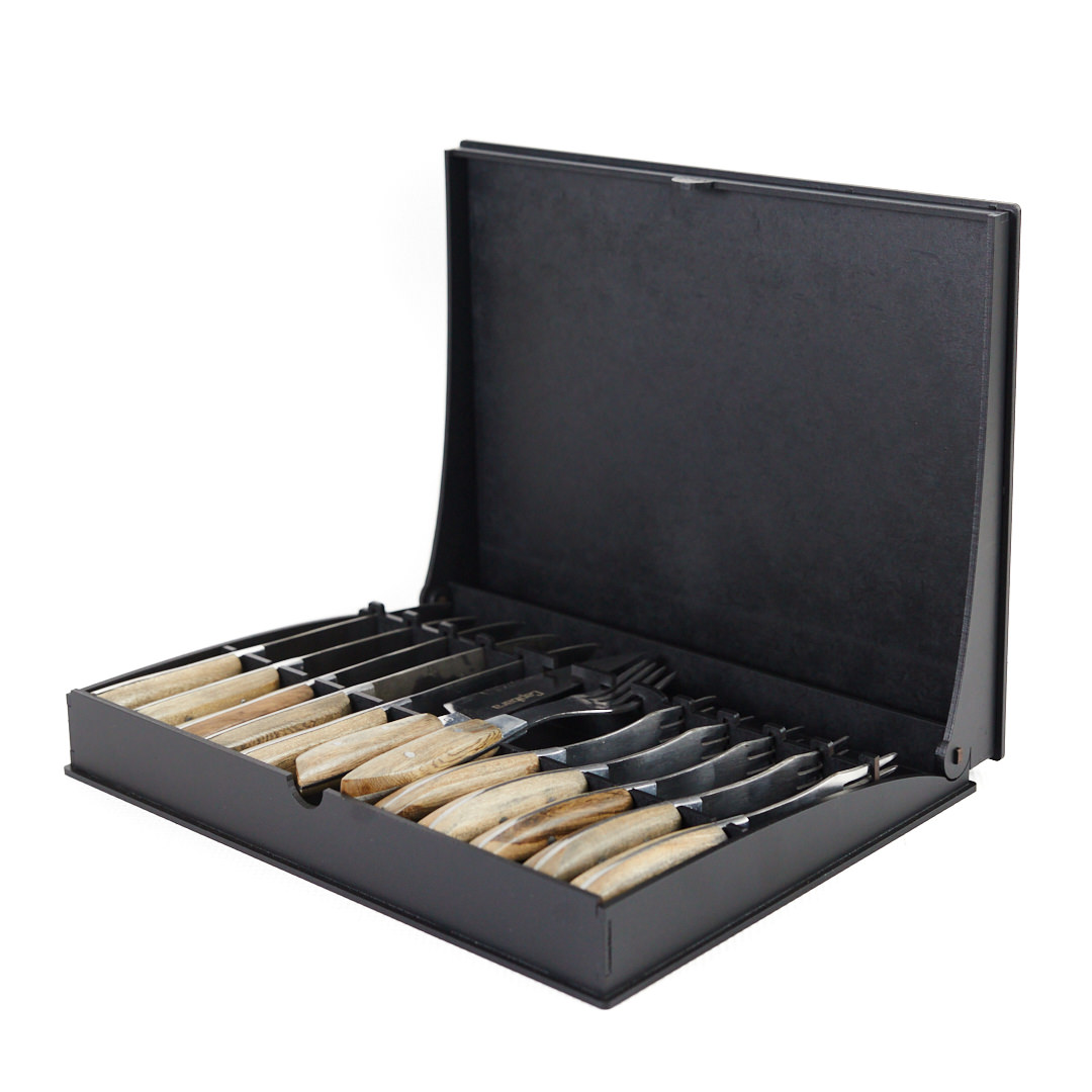 6 juegos de Cuchillos y tenedores (k20006) de acero quirúrgico inoxidable 420 con mango de madera de Guayubira. Hecho artesanalmente, afilado, listo para usar.