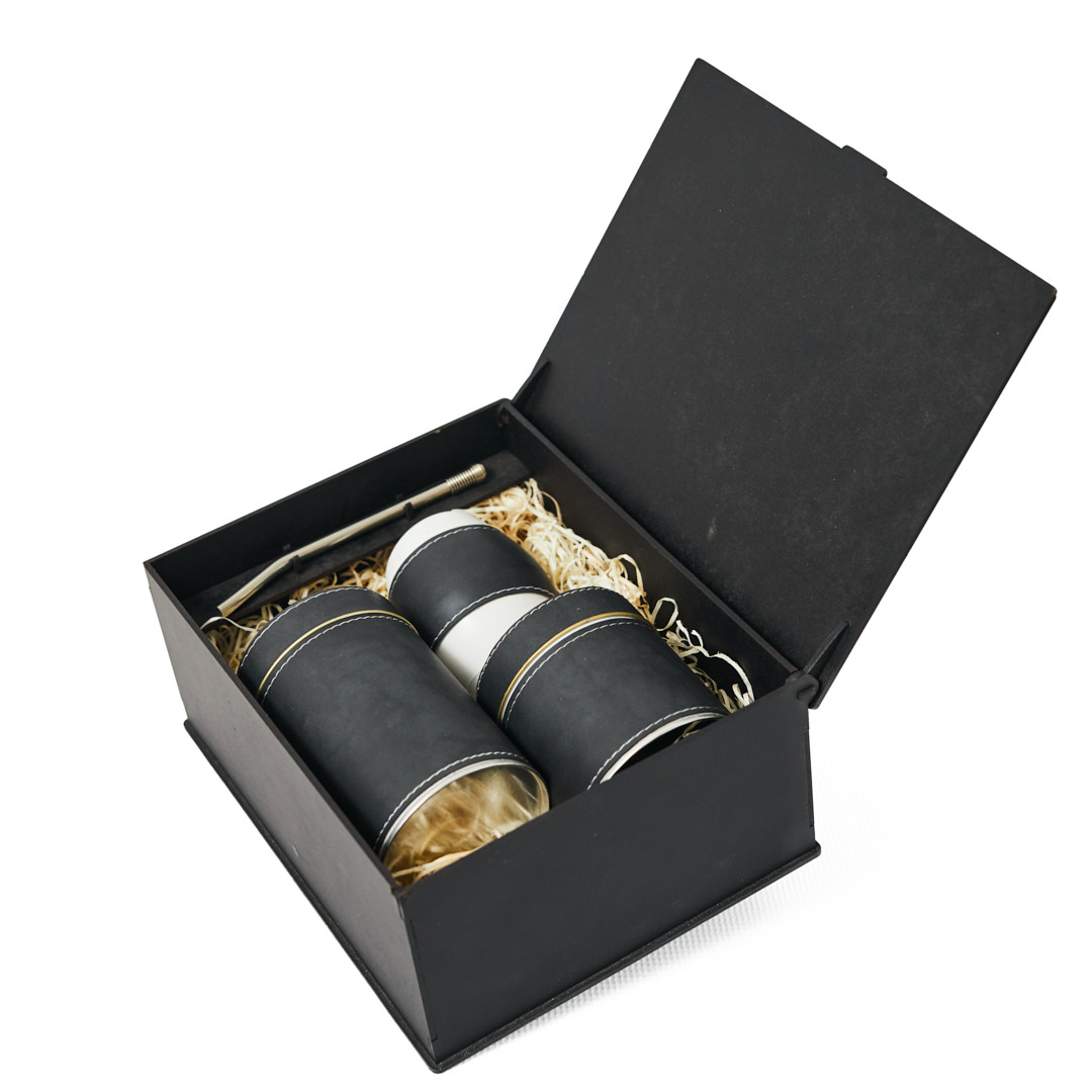 Lata para yerba de 12cm con pico vertedor forrada en eco cuero. Costura reforzada.