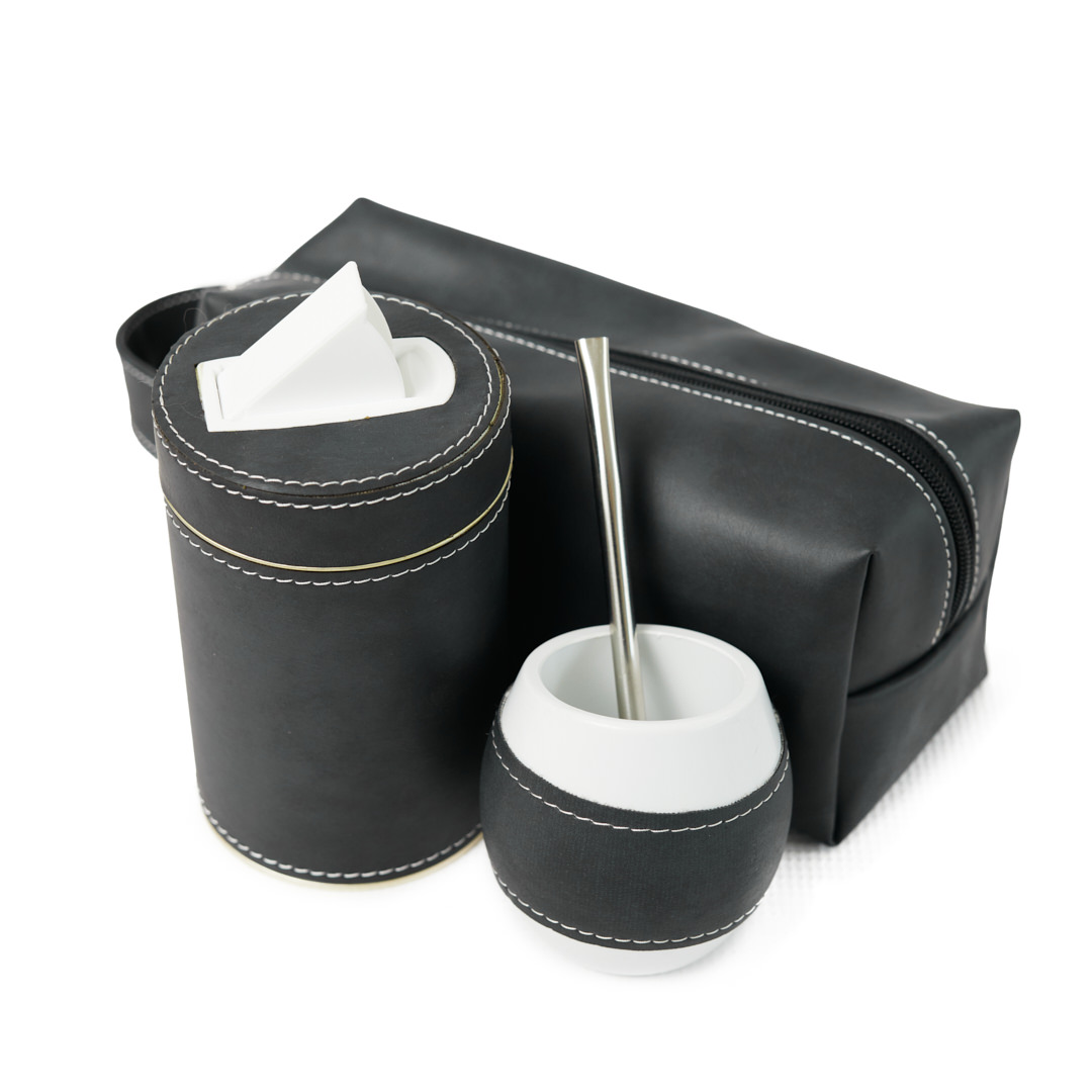 Lata para yerba de 12 cm con pico vertedor. Tapa y lata forrada en ecocuero. Costura reforzada.