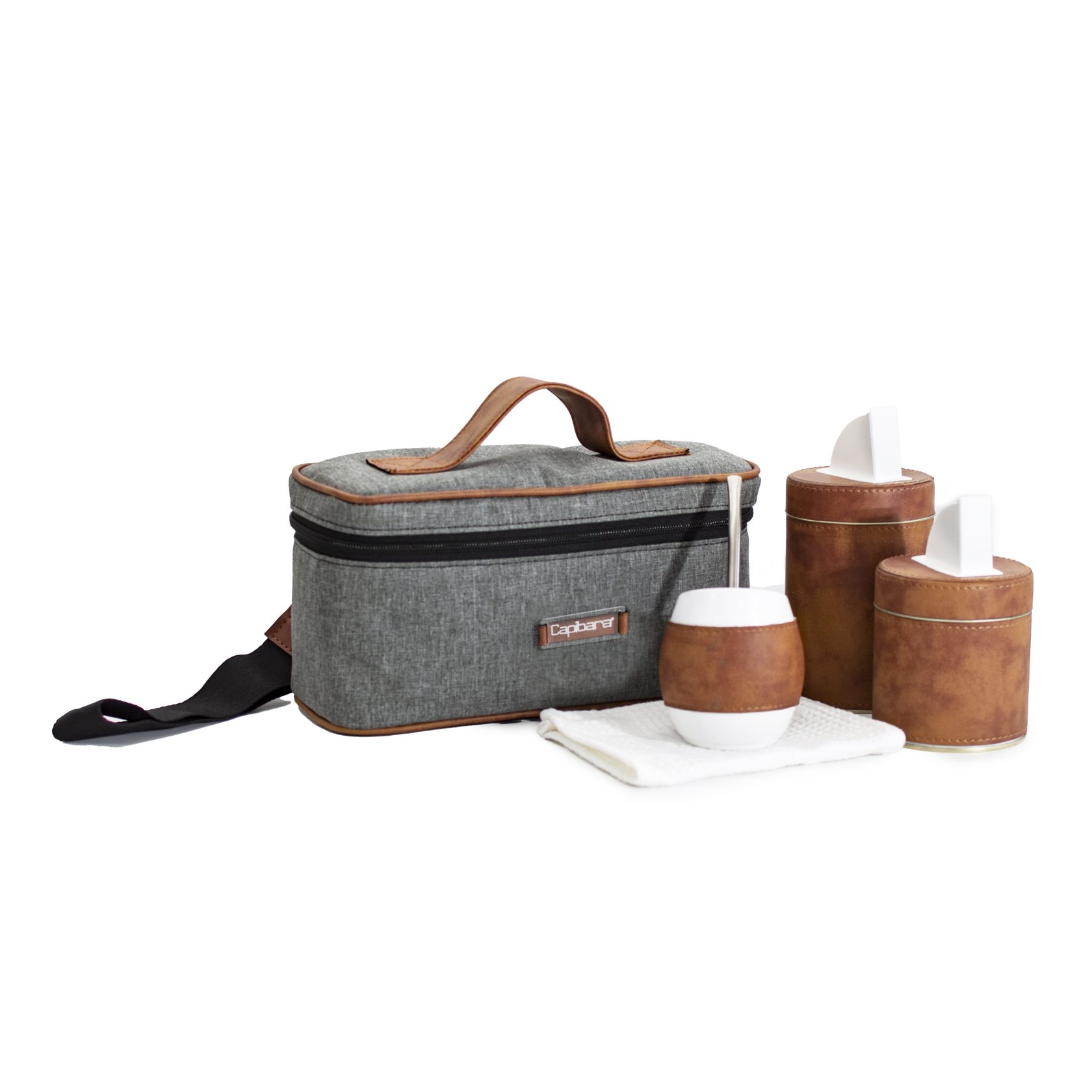 Neceser de cordura con detalles en ecocuero caramelo y cierre (Medida:14cm x 25cm x 10cm).