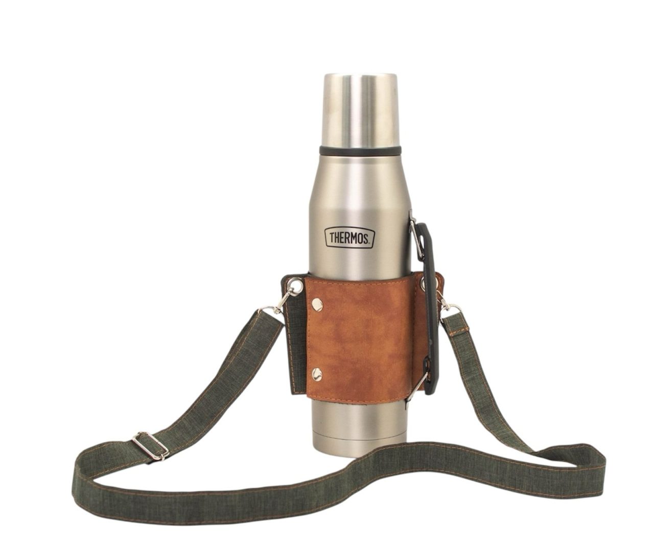 Porta termo con correa ajustable cordura verde con eco cuero caramelo.
