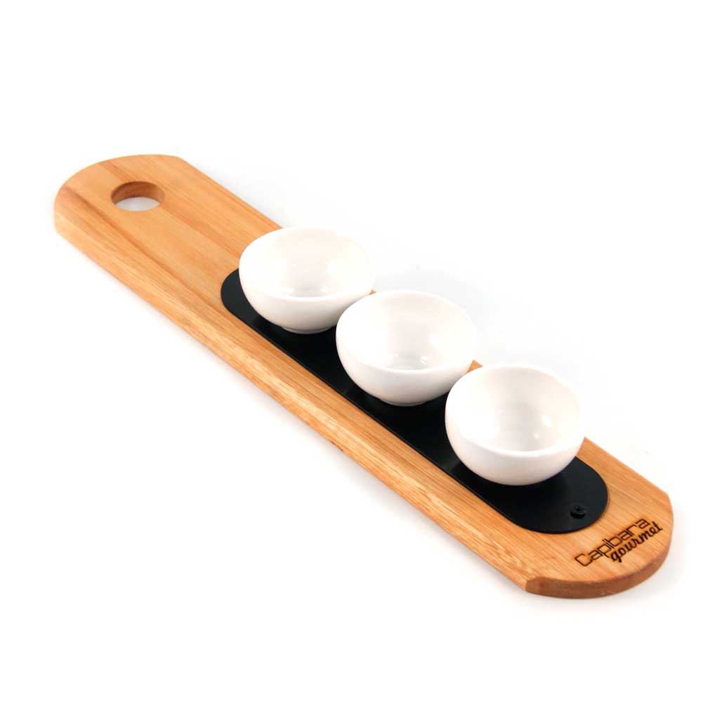 Tabla baguette de madera de Leuka, ecológica, semidura y curada con óleo vegetal. Contiene un aplique acrílico para contención los cuencos.
