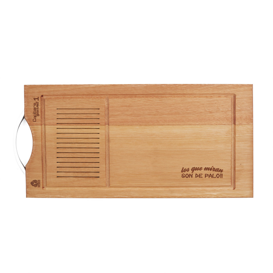 Tabla de madera de Leuka, ecológica, semidura y curada con óleo vegetal. Posee canal para goteo y asa de metal.